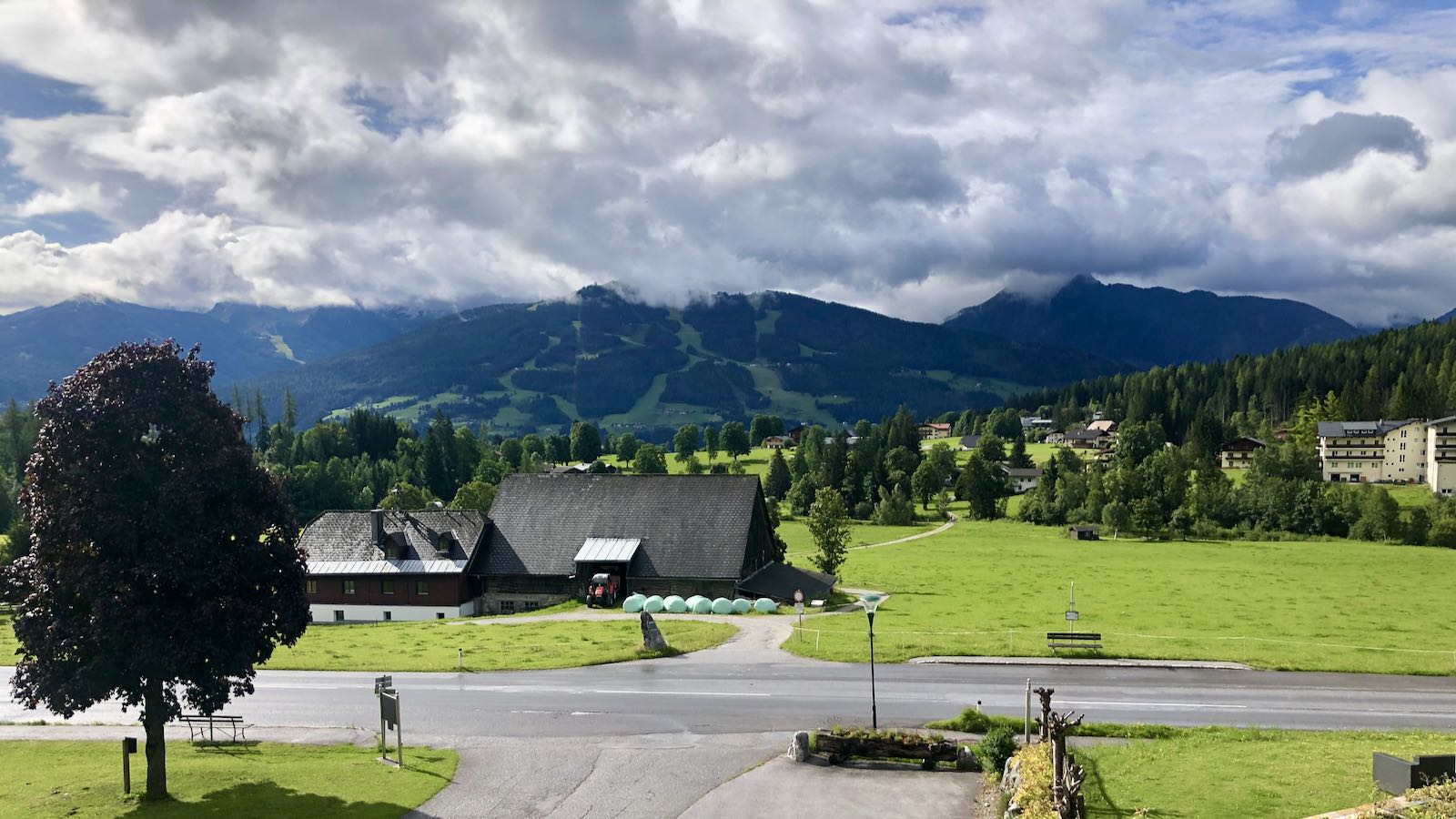 der Terrasse des Hotel „Berghof“ auf die Planai schaue, sehe