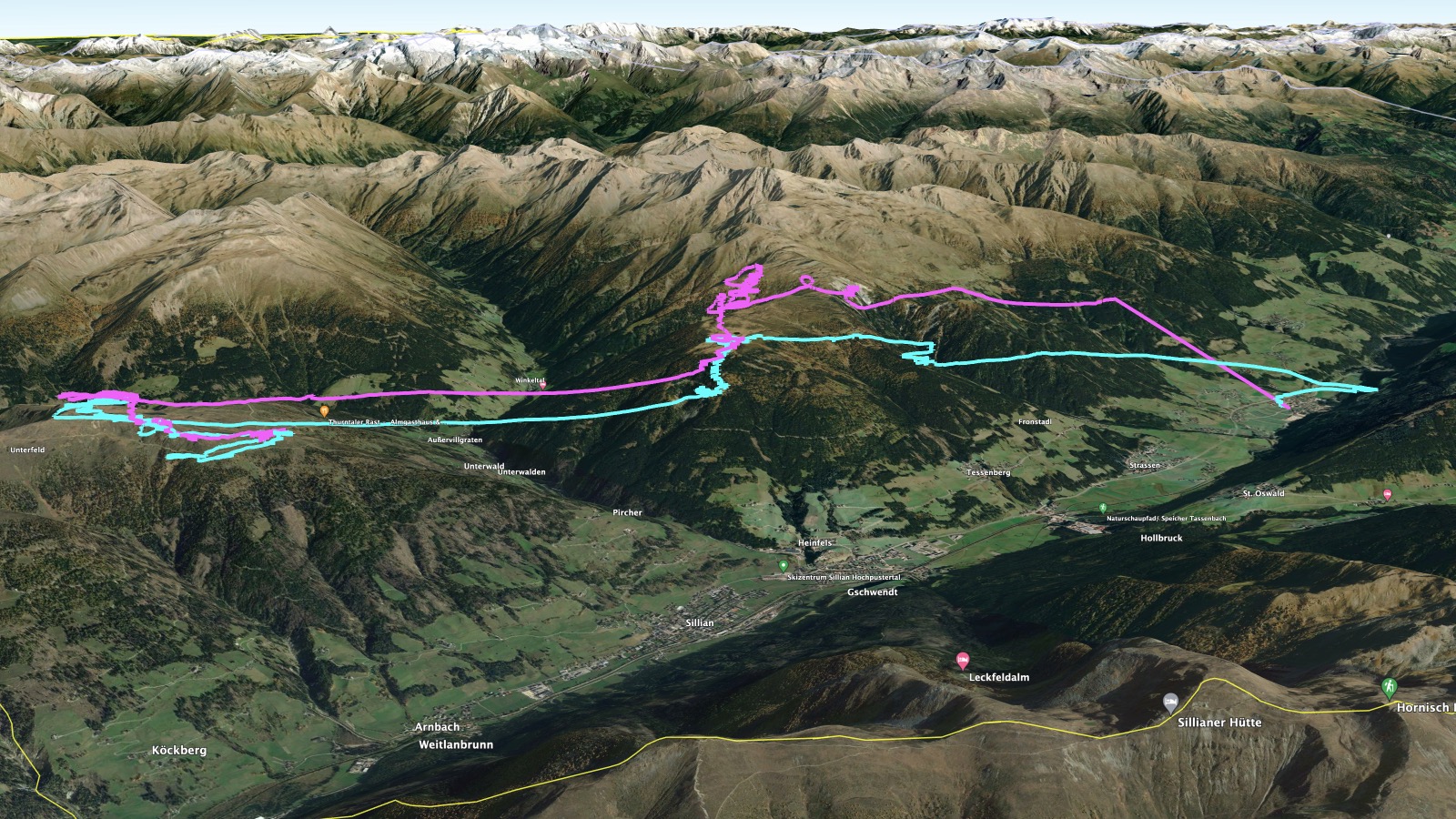 Vielleicht produzieren die von Süden heraufkommenden Bergeinschnitte verlässlichere Thermik, überlege ich. Aber es will nichts gelingen. Die Abschattung hat mich eingeholt. Ohne Hoffnung segele ich zur südlichen Talseite. Dort geht es auch nur noch abwärts. Eli schaut sich das Debakel aus der Höhe an. Als ich tief frustriert zur Landung in Abfaltersbach ansetze, spiralt sie zu mir herunter.