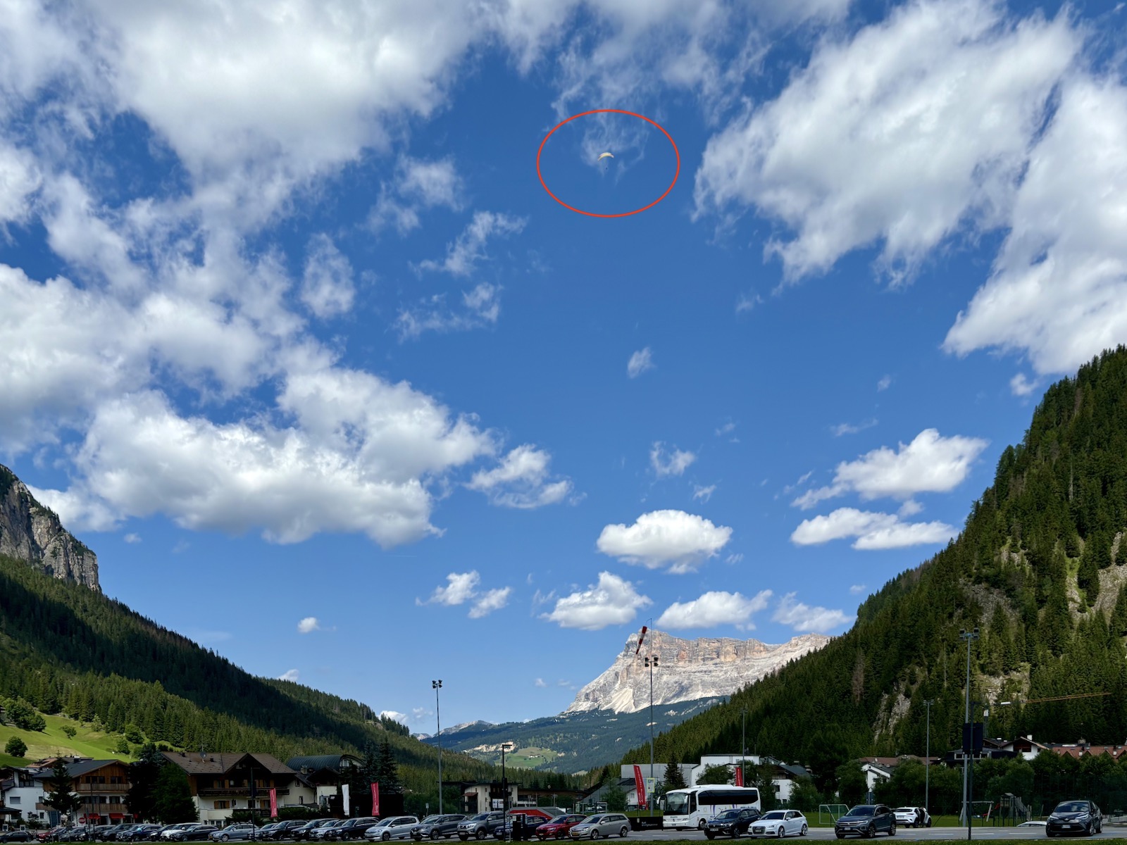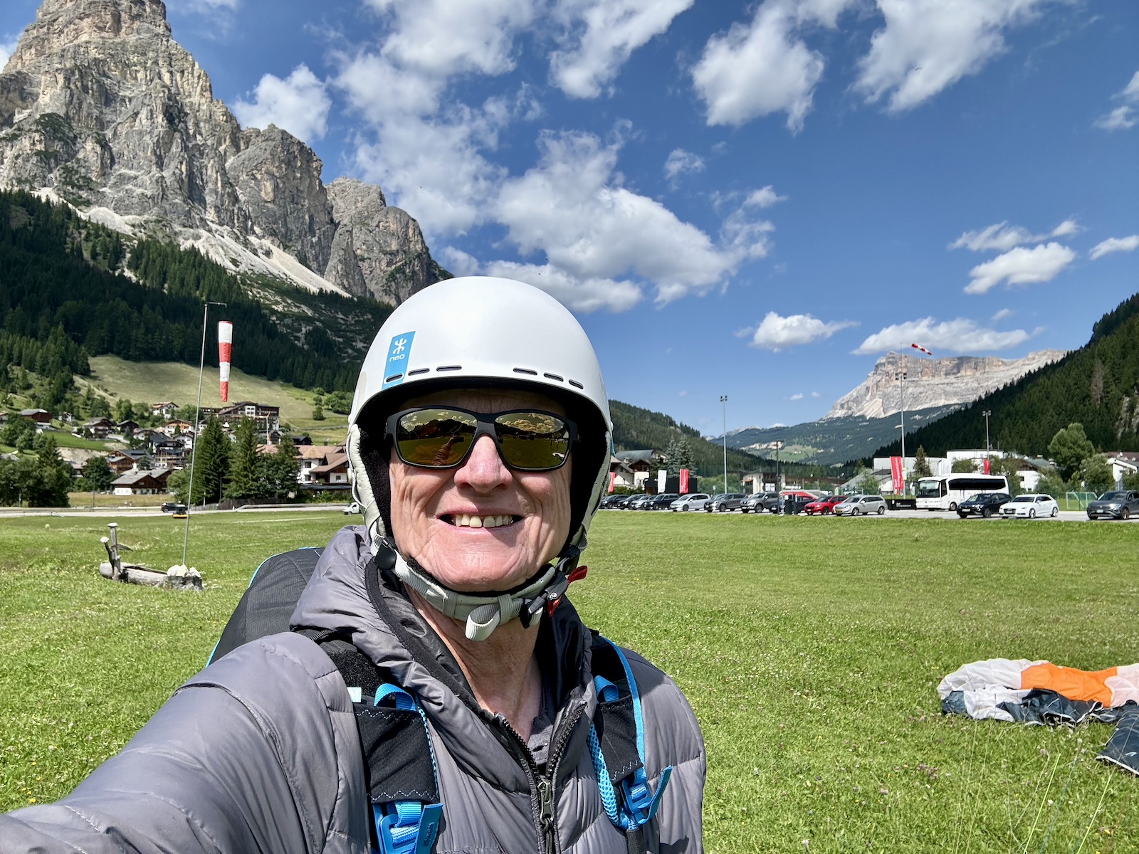 Während ich noch versonnen zurück zum Kreuzkofel schaute, gesellte sich Roberto, einer der beiden in Corvara tätigen professionellen Tandempiloten, zu mir. Wir kennen uns seit vielen Jahren. Als er auf seine Frage hin von mir erfuhr, dass ich am Kronplatz gestartet war, geriet er etwas aus dem Häuschen. Wegen des starken Nordwestwindes hatten er und sein Partner Alex nach einem Flug in der Frühe die weiteren sechs für den Tag gebuchten Tandemflüge abgesagt, und nun kam ich einfach so von Bruneck dahergegondelt.
