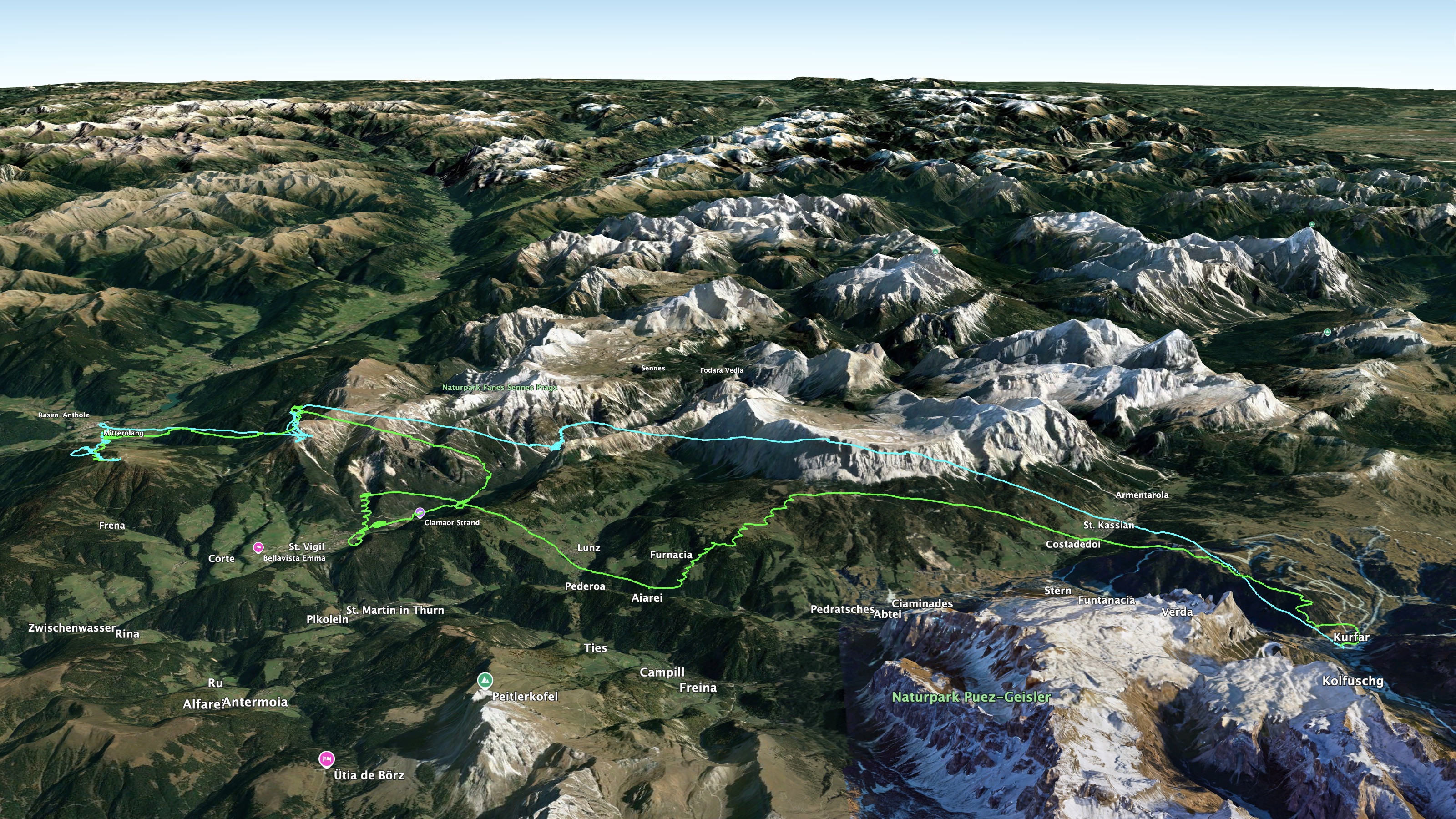 Nach der nächsten Querung war am Monte Sella kein Heber zu spüren. Auch Jürgen war geradewegs weiter über das Rautal (Ennebergtal) zum Piz de Pares weitergeflogen. So wie ich es im Flug beobachten konnte, kam er unterhalb des Grates an und folgte dann notgedrungen im Konturflug dem Hang nach Nordwesten gen St. Vigil.