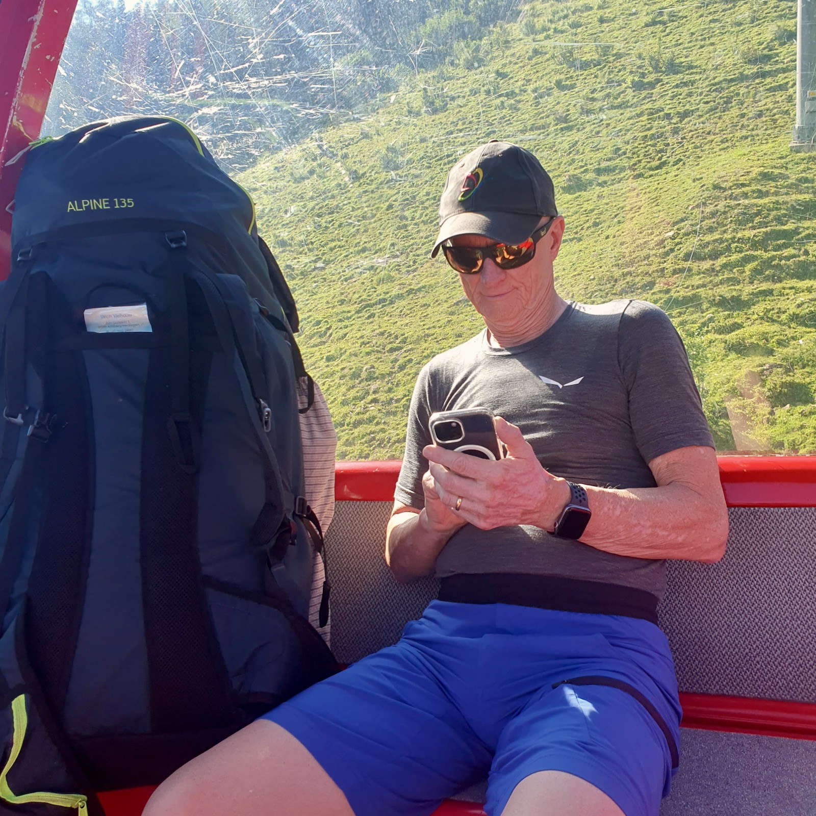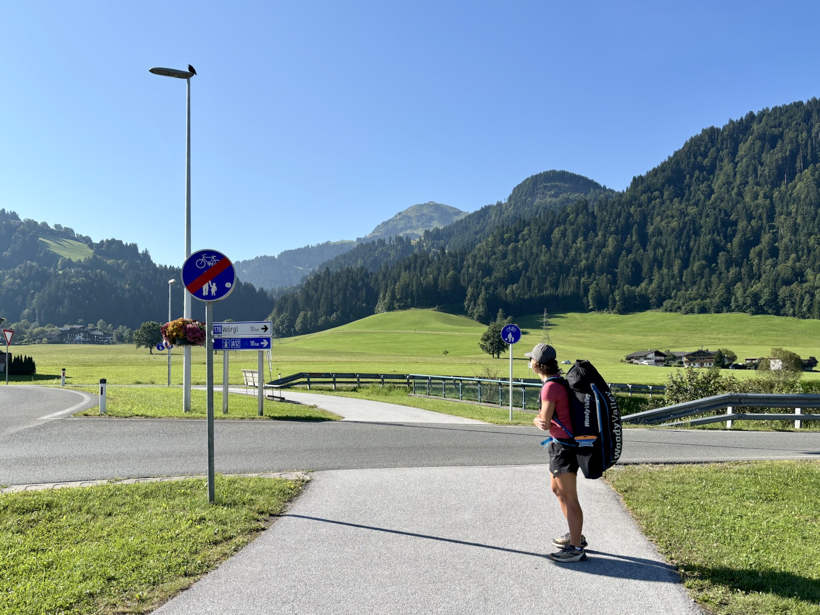 Allerdings hat auch Eli Bedenken bezüglich der Talquerung von der Hohen Salve zur Choralpe. Es könnte sein, dass wir auf der Hohen Salve lange auf die Thermik warten müssen. Würden wir dann an der Choralpe den Anschluss verpassen und neu starten müssen, könnte es bei der Ankunft in Zell am See sehr spät werden. Also beschließen wir, von der Hohen Salve einen morgendlichen Gleitflug nach Westendorf zu machen und dort mit der Seilbahn auf die Choralpe aufzufahren. Der abgemilderte Plan fühlt sich gut an. Frohgemut verlassen wir den Tennenwirt, laufen hinauf zur Talstation der Bergbahn „Hochsöll & Hohe Salve“ und fahren auf den Berg.